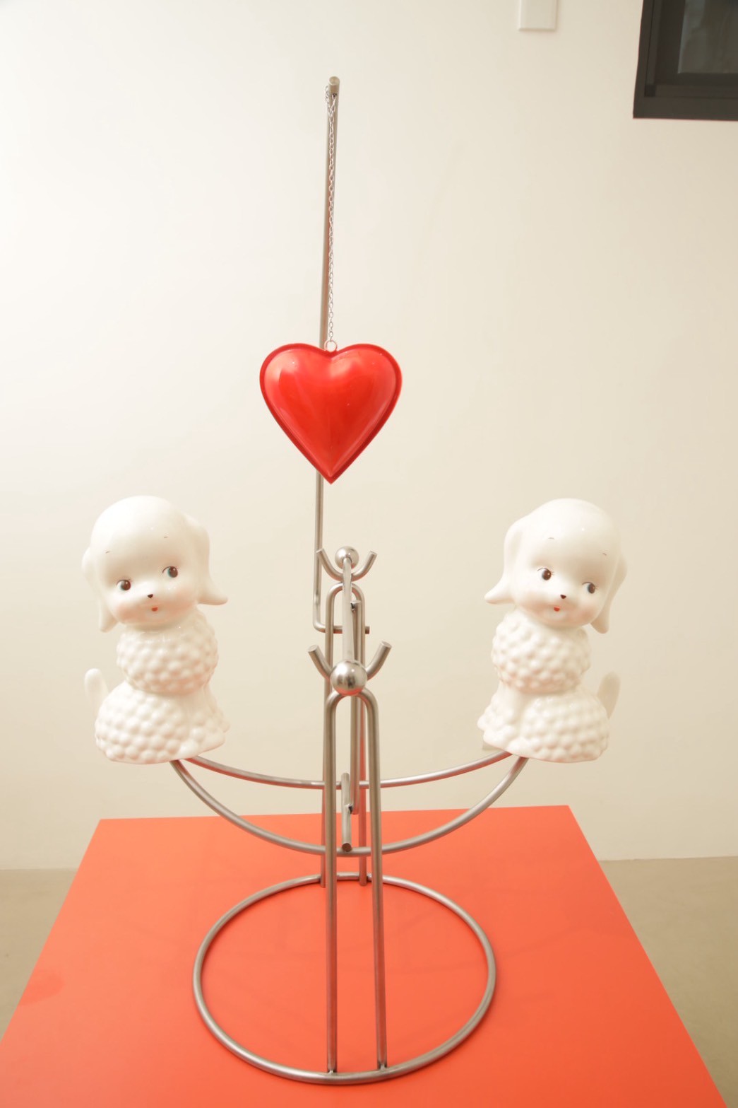 在展場裡,各個區域指向不同的居家想像,卻無法被完整歸類,片段的並置形成一種看似有秩序,卻無法回到純粹「家」的空間經驗,陶瓷動物因此暫時脫離原本在家庭中所擔任的陪伴角色,轉而成為被檢視的存在,它們的姿態、視線與位置在展場中被放大,提醒觀者這些溫順可愛的形象,長期承載著人們對幸福與理想生活的投射。展間中,實體作品與影像〈新摩登家庭〉並行展開,靜默的物件與被賦予情境的角色相互對照,不斷提醒觀者意識到所處的位置,當原本屬於家的物件被移放入展場,它們既像是在展現熟悉的家庭場景,又因展示而顯得有些突兀,迫使觀者重新思考「我們究竟是如何觀看這些物件,又是如何在觀看中,被它們所形塑。」