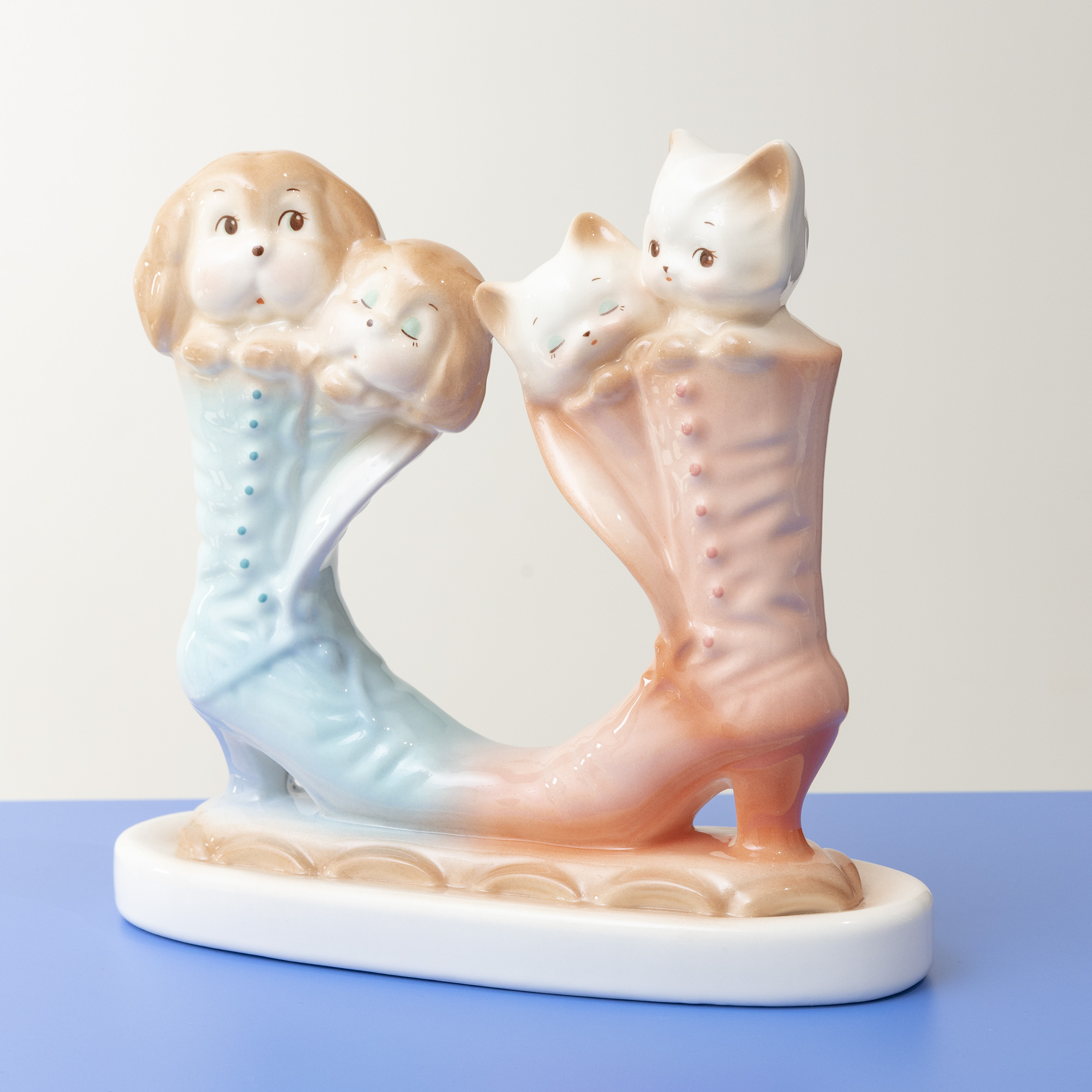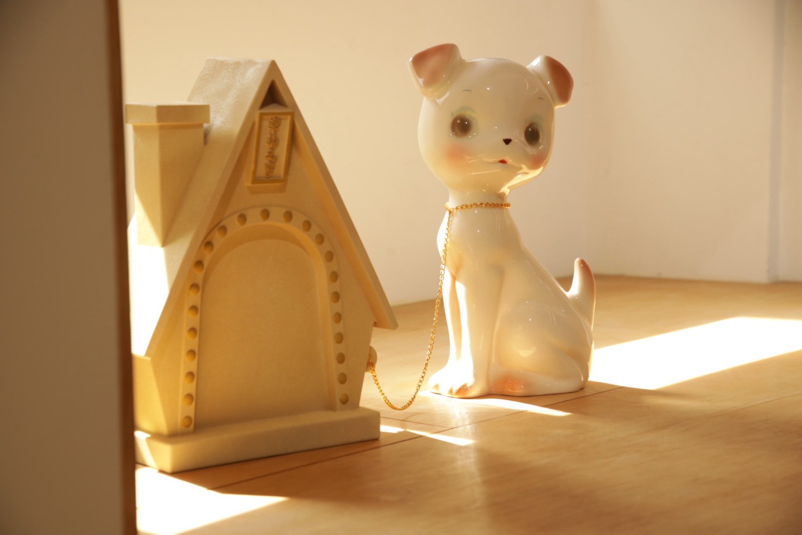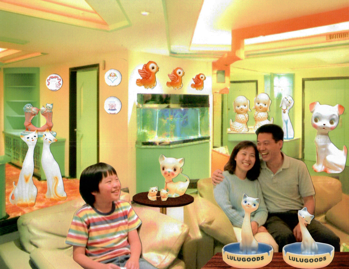 早在台灣六、七○年代,人們正處於戰後動盪與快速現代化的過程中,對於安穩、和樂生活的渴望,逐漸匯聚成一種集體的家庭想像,陶瓷藝品成為承載這些理想的容器,它們被塑造成各式動物的形象,姿態溫順、神情正向,彷彿是幸福美滿的守衛者。物件被擺放的位置,也反映了人們所賦予的功能與期待:置於家中的動物瓷器,是陪伴日常的存在;放在門口的犬類藝品,則象徵著守護與安心,人們透過這些外在物件,不斷確認自身所相信的價值,並在無形中建構出所謂的「理想家庭」樣貌。