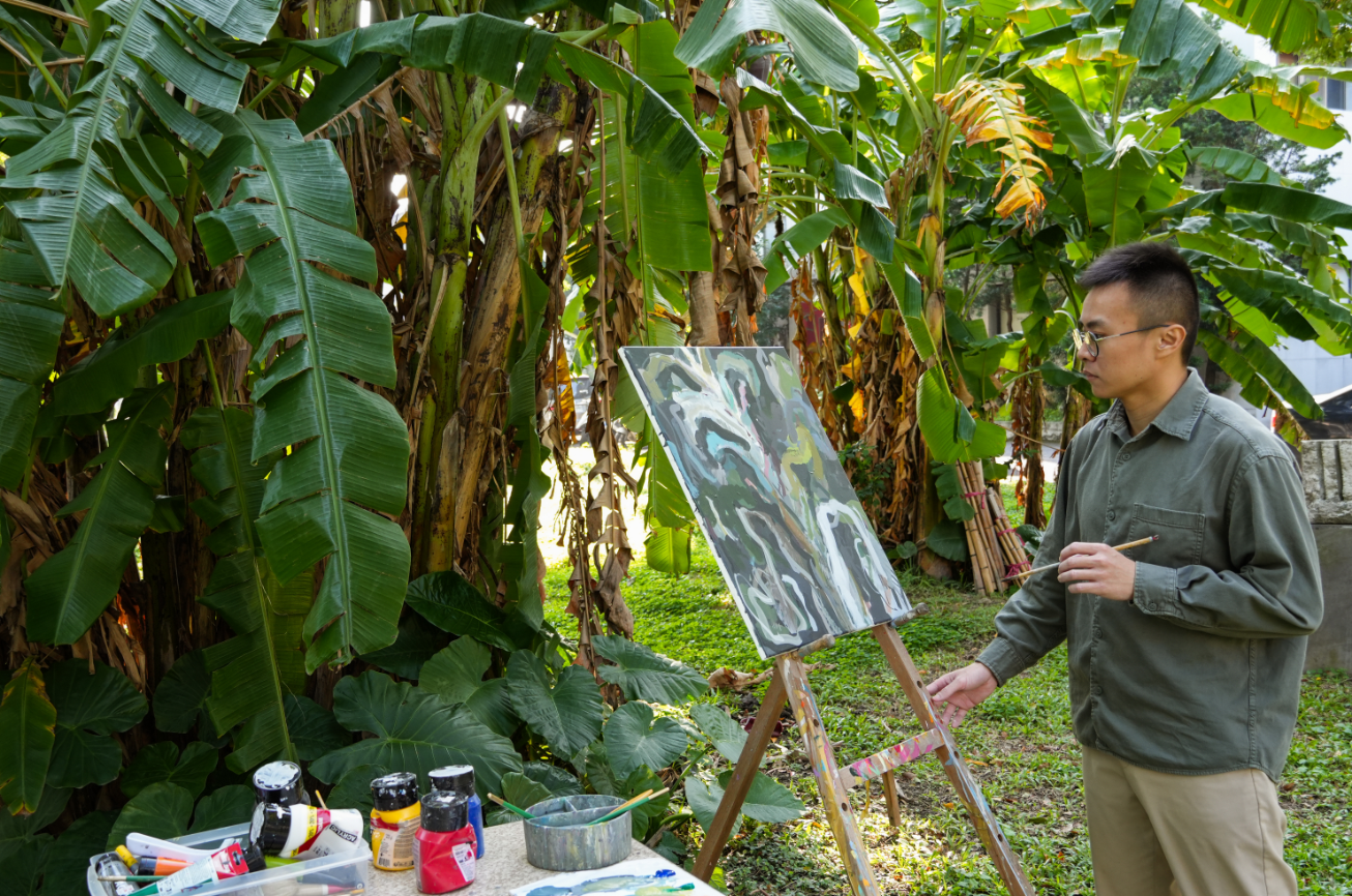 談到即將到來的展覽,他希望把多年反覆推敲的成果集中呈現,也希望作品在空間裡保持一種「密度」——尤其是小尺寸作品,他想排得更緊一些,讓觀眾看見那種長年累積、反覆修正的軌跡。策展者則提醒,留出呼吸空間能讓觀看更舒適;他理解,但仍想保留某種壓迫感,因為那更接近他在芭蕉樹下的真實狀態:一種不停推敲、又不停被天氣打斷的勞動節奏。這不只是一場關於植物的展覽,更像是一份關於時間、身體與信念的總結。當觀眾走進展場,看見線條交錯、顏料厚積,聽見的也許不只是風吹過芭蕉的聲音——還有一位藝術家在自然面前,誠實、劇烈、但始終不肯偷懶的呼吸。