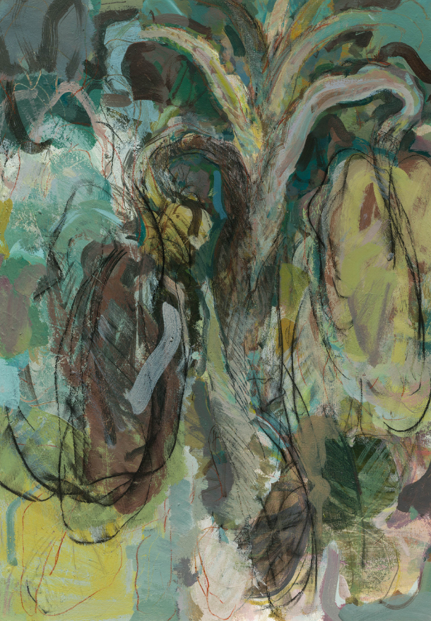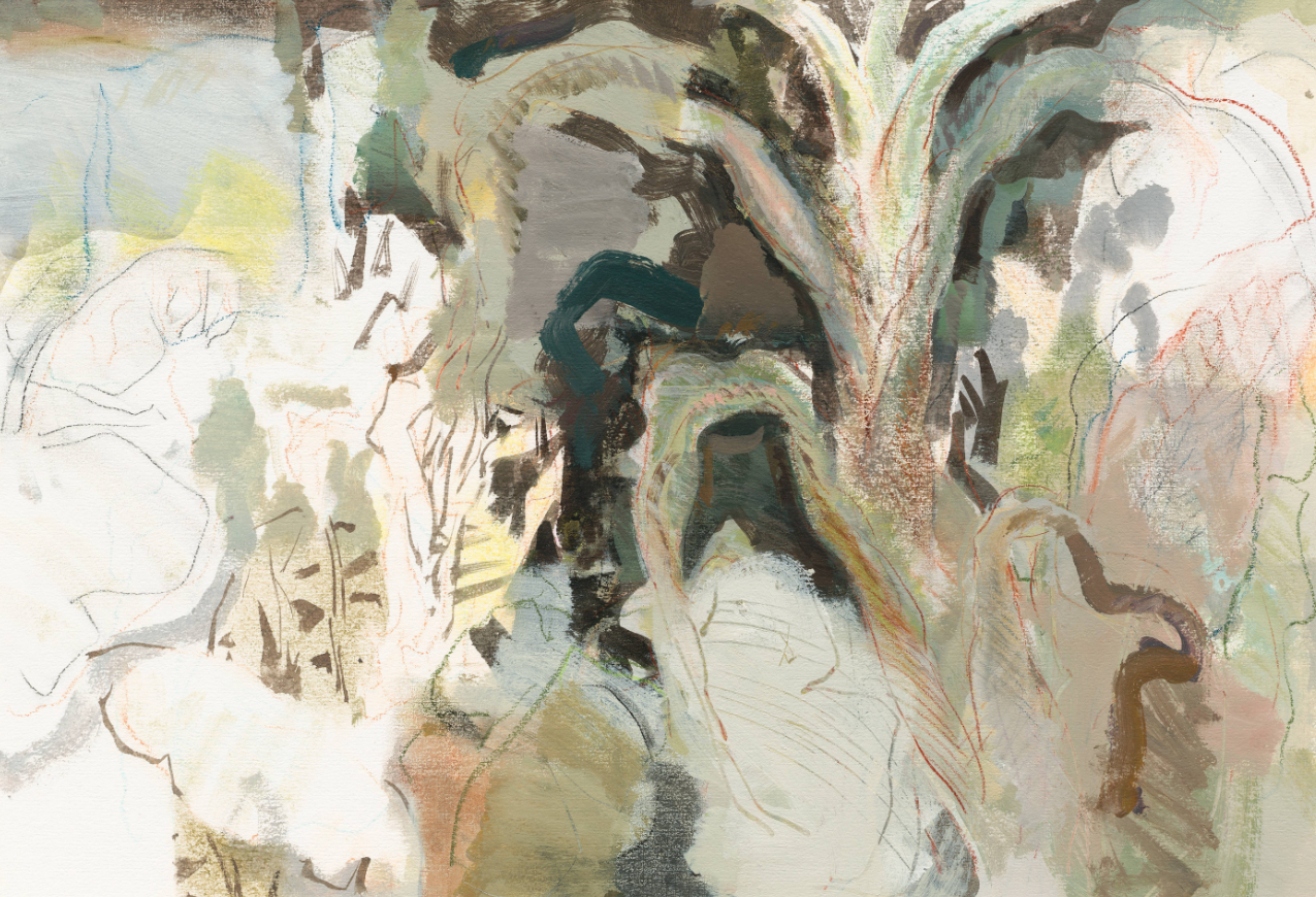 劉晏嘉長期以芭蕉為題材的「芭蕉樹系列」,始於2018年,2019年後進入連續創作。早期他採取定點觀察,試著把「眼睛所見」以自然主義的形式,盡可能誠實地留在畫面上;直到一次回老家,連雨三天後,他在第四天走回樹下,突然發現熟悉的形體位移了。「我那時才真的意識到,植物是在長的,整棵樹會慢慢旋轉。」他說,「原本的葉子會跑到另一個位置。」那一刻,他明白自己面對的不是一個可以被「固定形體」的物件,而是一段正在發生的時間。這個發現改變了他後來的畫法。到了2022年的作品,他刻意讓輪廓變得不那麼清楚,線條反覆疊加,形體像被拆開又重新組裝,呈現一種明顯的「解體」傾向。這並不是要把芭蕉畫得更抽象,而是要避免觀者用最快的方式把它變成一個符號。