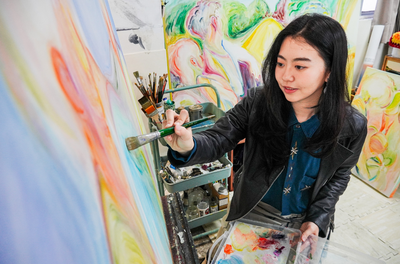 顏子耘的藝術生命並非直線,而是呈現一場不斷跨越邊界的游牧。回望她的成長路徑,從東海時期留白、過曝的狀態,到進入清華大學初期厚重、塊面分明的結構,再至現階段線條輕盈且飽含水氣的風格,紀錄的不只是技藝的精進,更是生命狀態的轉變。跨媒介的經驗豐富了她的繪畫語言:在參與錄像創作時,她學會了思考「鏡位」的視角立場,這讓她的二維畫面產生了一種奇特的、四維的時間感與深度空間;壁畫工坊的磨練,則徹底打破了她對「尺度」的認知。她曾感悟道:「原來不是畫太大,而是心還不夠大。」在受限的顏料條件下,學會了如何在有限的色彩中,依然保持畫面的對比與明亮度。這些養分,最終都匯聚成她如今那種既具備宏觀張力,又不失微觀細膩的藝術風格。在許多藝術家急於確立「視覺標籤」的當下,她反而期待擁抱一種「不精準」的可能。