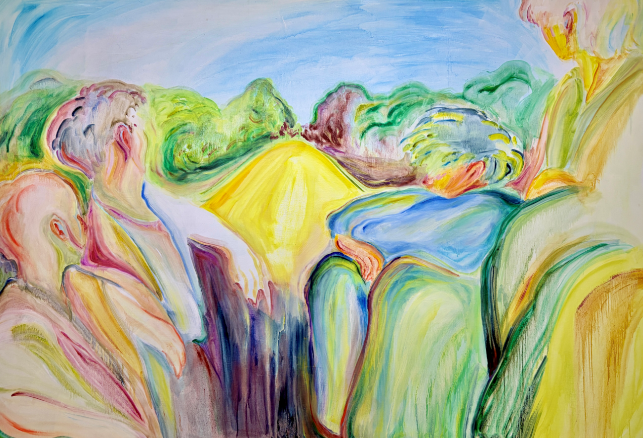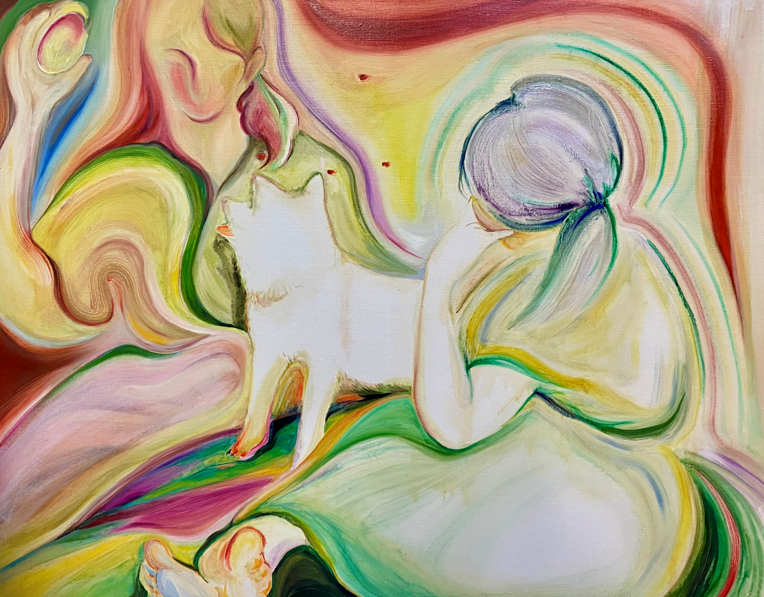 這種「滲透」,隱喻著人與人交會時邊界的消融。畫面上衝突的色彩——如帶有侵略性的紫紅與充滿生機的黃綠——並不彼此吞噬。相反地,它們在相鄰的邊際處,產生如教堂花窗玻璃般的透光感,轉而達成一種「不安分的平衡」。這正是她對親密關係的觀察:兩個人在依存中滲透,卻始終守住各自最純粹、不被抹除的氣質。她有意識地背離了古典油畫那種帶有威權感、一層層如磚瓦般的厚重堆疊。她讓畫面上的不同色調並存,讓矛盾在光影中共舞。這種審美選擇背後蘊含著深層的倫理觀:在這個傾向於同質化的時代,她選擇承認差異,卻仍堅定地選擇靠近。她讓觀者在那些細碎的筆觸與微妙的層次中,看見「我們」這個複數詞彙,是如何在無數次的試探與修補中,艱難而美麗地成形。