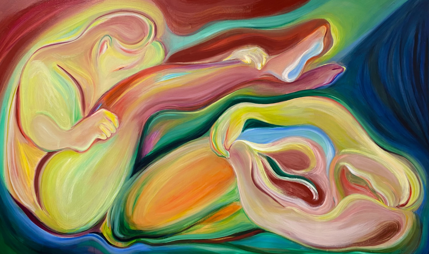 走進顏子耘的創作世界,首要感受的是一種近乎「液態」的感知邏輯。在此次《親愛的、屈身的我們》的展覽中,她展現了關於「滲透」的感性語彙。這種技法源於她對人際關係最直觀的視覺轉譯,她刻意挑戰油畫媒介的物質性,讓色料保持在半濕潤的狀態,這需要藝術家對時間與濕度有著極其敏銳的體感——在那顏料即將乾涸卻仍具流動性的瞬間,讓不同色塊在畫布上自然溢流、交混。