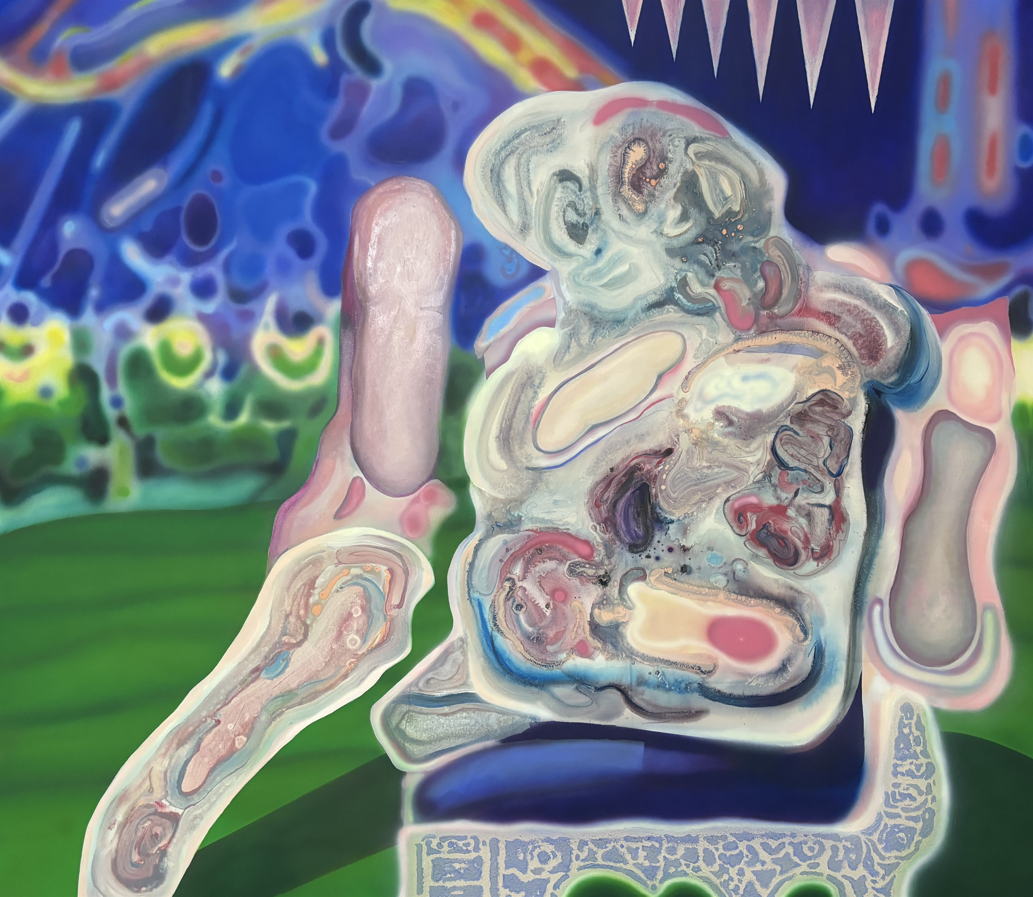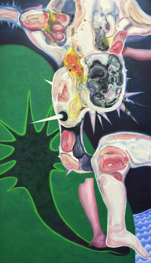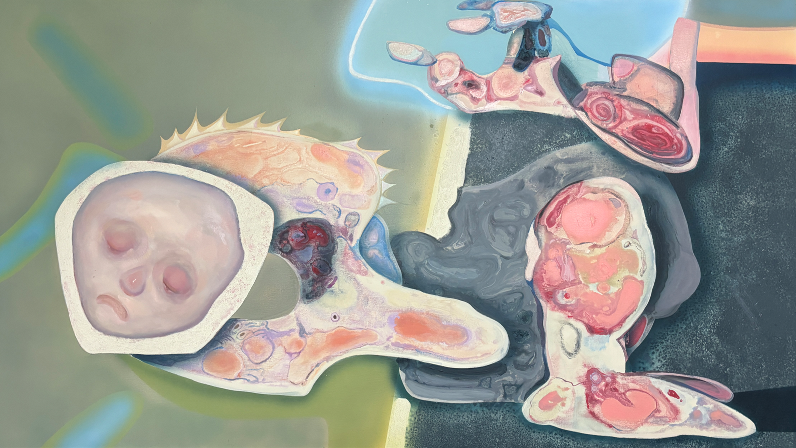 林東磬借用了西藏生死書中「中陰」(Bardo)的概念來形容這樣的狀態,一種持續變動、尚未定型的過渡狀態。在這之中,自我並不是穩固的,而是不斷變形、游移的。畫面裡的軀體像被切片般被劃開、散落,缺乏骨架的支撐,呈現出一種崩解、潰流的臨界狀態,也顯示出在外在環境與自我實現之間來回拉扯,既想靠近,也不斷退後。