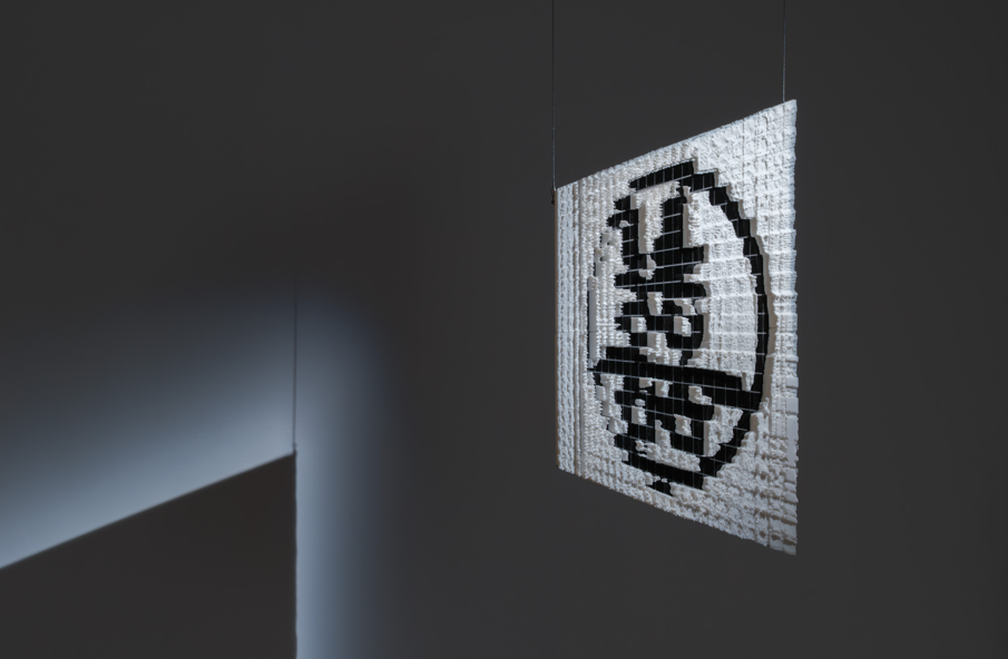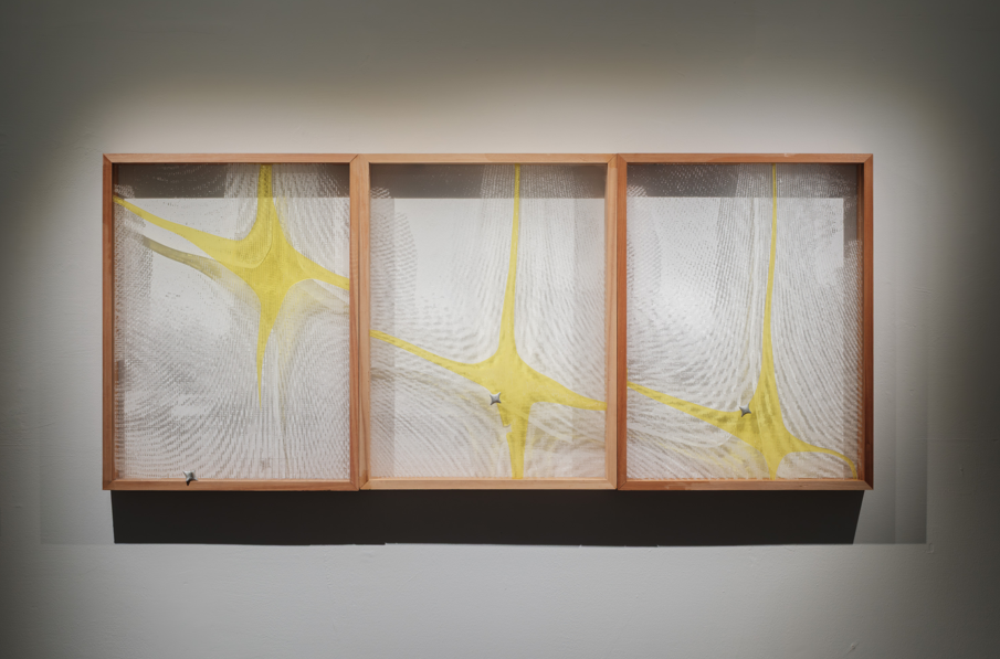 在2023年時,她就曾嘗試以壓克力分層來表現摩爾紋的影像造型,到2025年時,她採取新的方式,使用了Python與3D列印,利用數位影像的灰階色調來佈局3D模型網格的聚散,以達到視覺上的空間感。在列印材質上以TPU軟性材料列印,使作品具有類似於織品的柔軟度,來回應紗窗的形象。這種媒材上的切換,不單純是藝術家在操作上的轉變,而是在創作語彙上更精準的實踐。