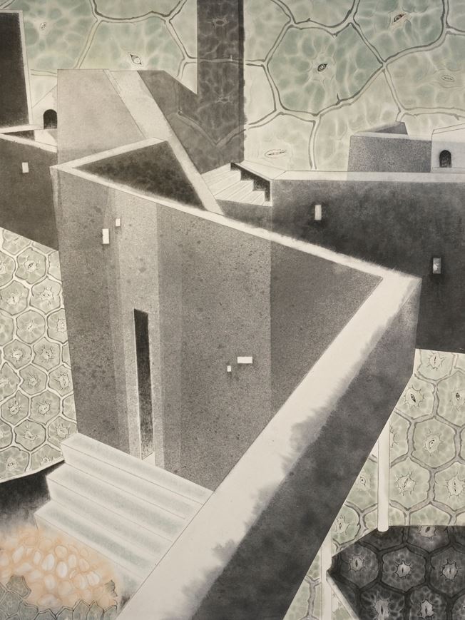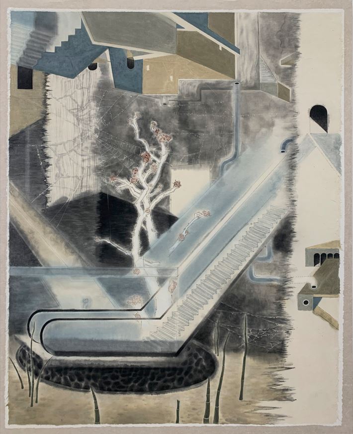 她常以淡墨與留白為畫面的起點,透過皴法、覆染與重疊筆觸,讓結構在層層堆疊中生成厚度與時間感,使牆面與建築輪廓不再只是靜止的平面,而帶著濕潤、含蓄重量的質地。當乾筆的紋理與水痕交錯時,畫面在理性的構築與感性的流動之間取得平衡,既嚴謹又脆弱,如同秩序正在邊界上顫動。