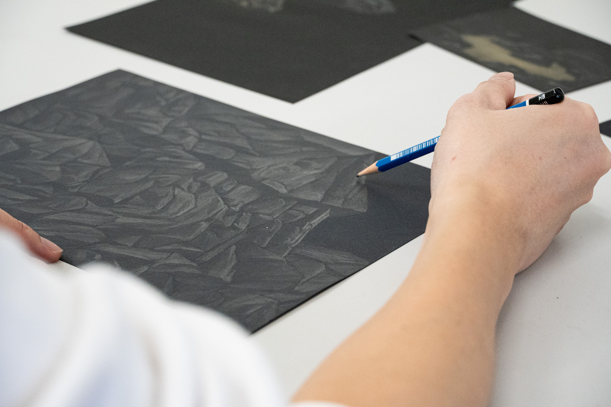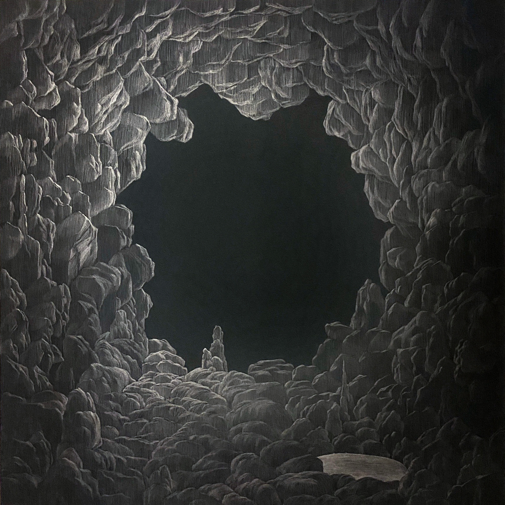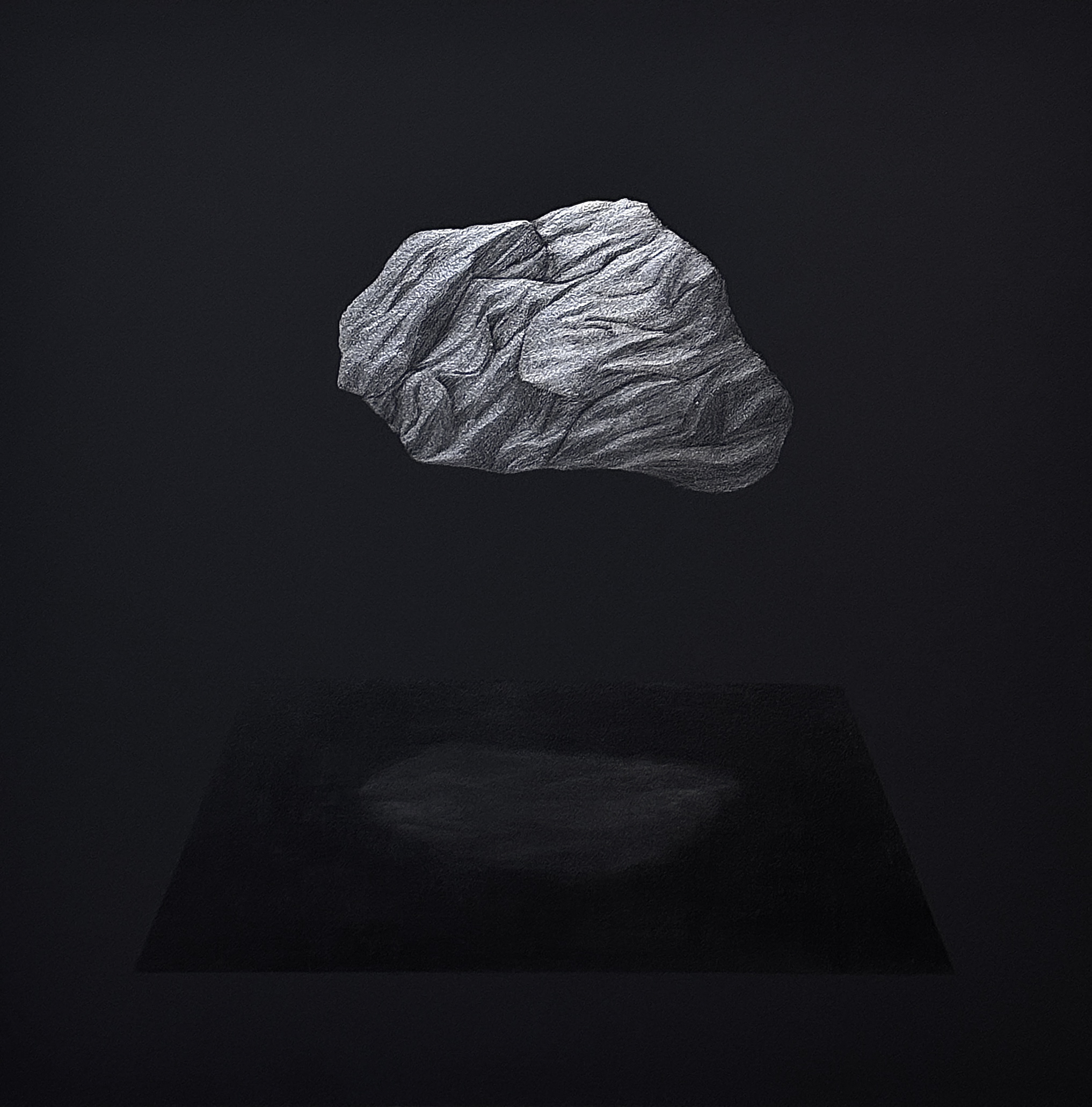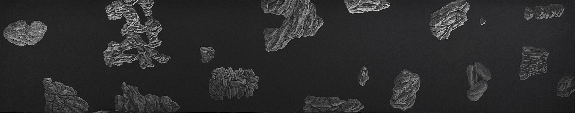 黃立穎的創作主題聚焦於自然有機物中的礦石,選擇礦物是它代表著時間存在的痕跡與狀態,而創作媒材石墨,不僅僅是繪畫工具,更是紀錄自身動作的媒介,創作當下就如同漫步本身,皆為一種過程,將當下的感受與情緒融入到畫面當中,彷彿再重新體驗遊走中的身體感知,每一層石墨都在代表著他曾經走過、駐足、回頭的瞬間,畫面本身不是物件描繪,而像是種記錄「曾經發生過什麼行為」的痕跡,在快速的當代社會中,讓感知慢下來,將當前的選擇延後僅須關注於當下的感知。