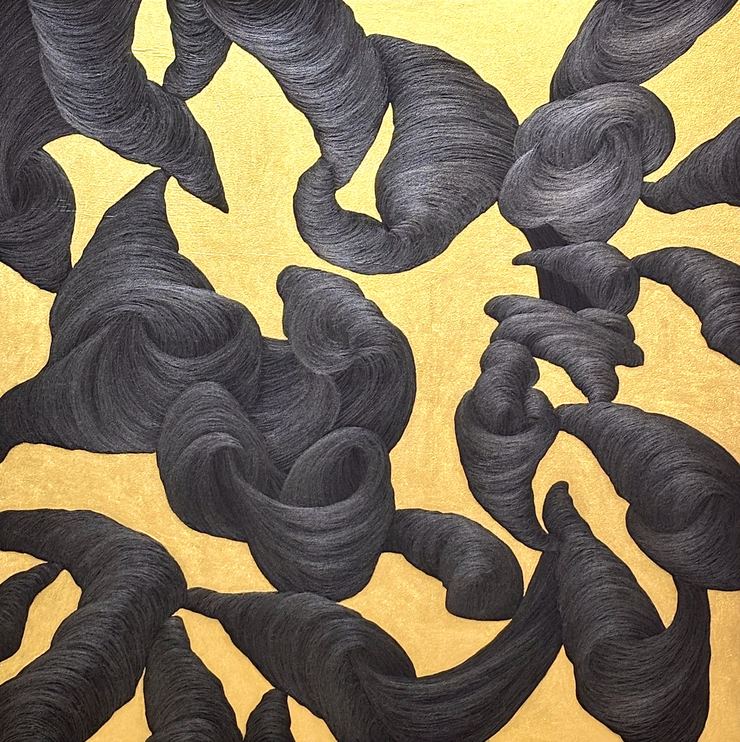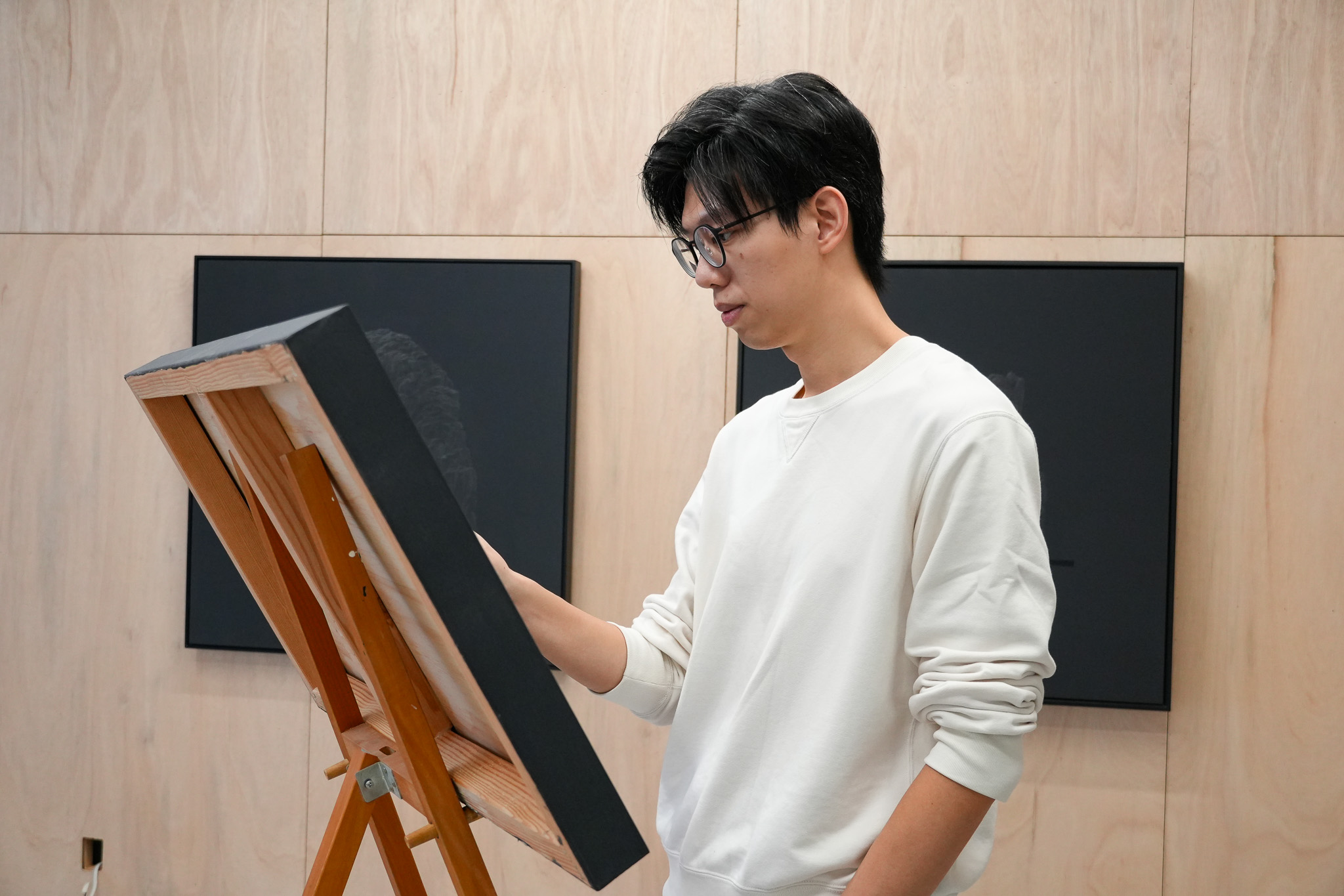 當觀者走入展場,觀看不再僅是停留於畫面之前,而是在走近、退後與移動之間逐漸發生,視線隨著身體的位置變化,在畫面表層的反光與層次中來回遊移,觀看成為一段需要時間流動的經驗。黃立穎並未為作品設定單一的觀看路徑,而是讓觀者以自身的節奏進入畫面,如同藝術家在世界一隅中晃悠,於停頓與位移之間感受感知的變化。走近時,細節與痕跡逐漸浮現;走出後,畫面又回到一種未被定義的狀態,觀看不再是完成與理解的瞬間,而是在反覆靠近與離開之中,持續反應的感知過程,邀請觀者在靜默中重新感受那些日常中容易忽略或遺忘的片刻。