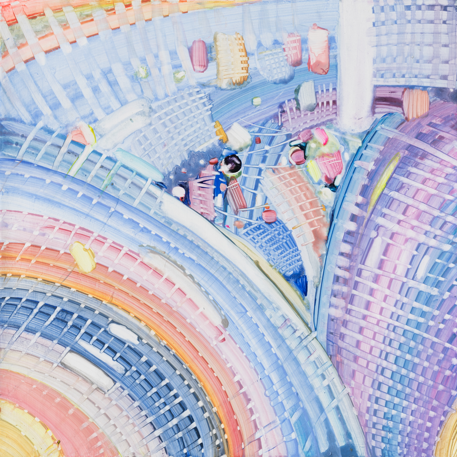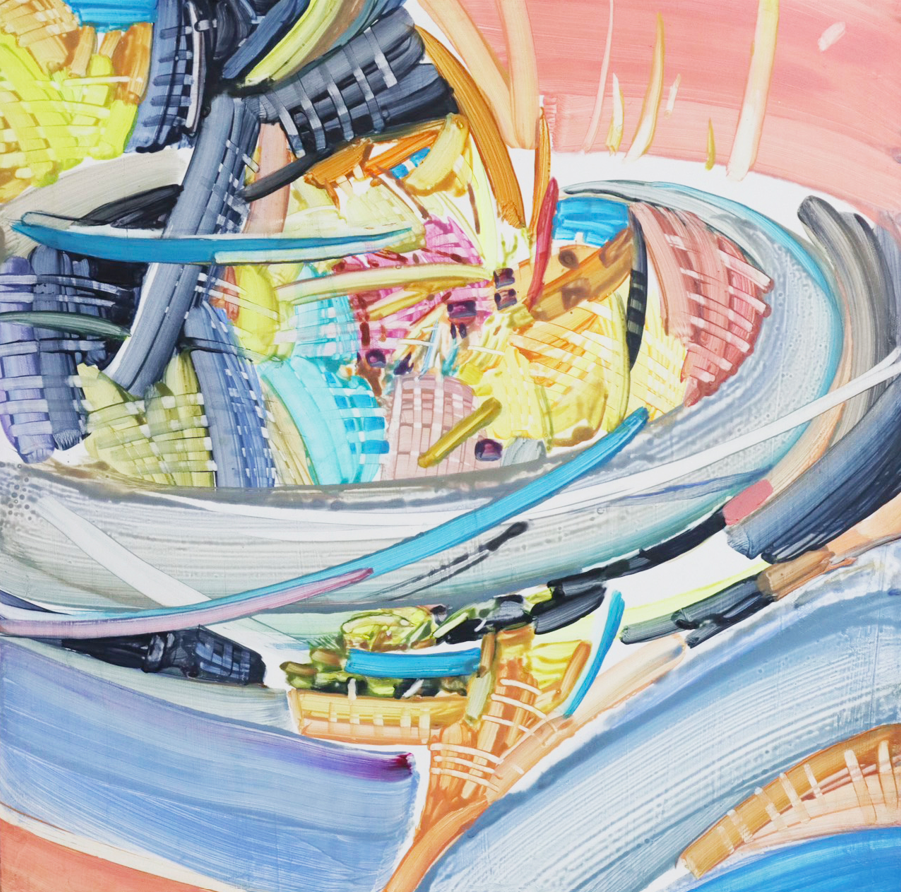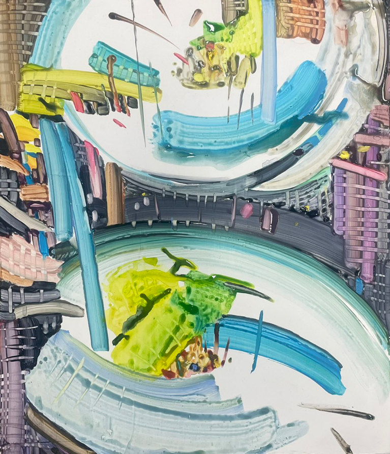 在闕珮菁的作品裡,筆觸不再是作為描繪對象物的手法被呈現,來回的堆疊與刮抹,使畫面留有了過程的痕跡。藍色的流線橫越其間,將零散的色塊暫時收攏,又在下一瞬間鬆動結構,畫面的秩序始終維持在滿溢的邊緣。