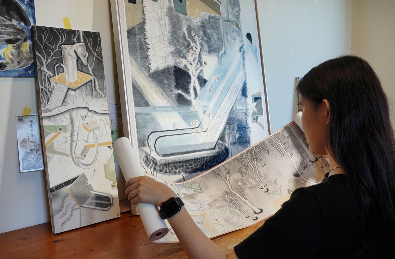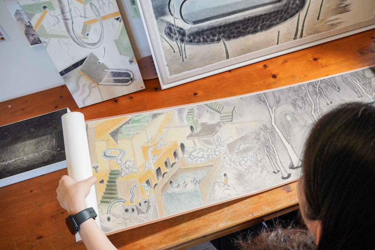 創作中她刻意選擇長幅、手卷或立軸的形式,讓觀看成為一種具有時間感與身體感的經驗。觀者無法一次看見全貌,必須隨著畫卷的展開、視線的移動,緩慢揭示畫面的節奏與呼吸。「我喜歡這種必須移動身體的觀看方式,」她說,「拉近、退後、在畫面裡游走,讓觀看變成一段旅程。」