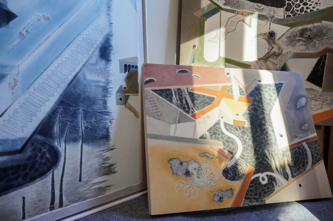 另外她也提到,自己的空間安排受到兩款遊戲啟發《樂克樂克》(LocoRoco)與《紀念碑谷》(Monument Valley)。前者揭示地圖的形式推進,後者則以錯視與不可能的建築結構創造出迷路與遲疑的體驗。這些「遊戲的空間邏輯」啟發她錯置建築線條以及超越常規的構圖視角,讓觀看者如同遊戲玩家般,在紙上的迷宮裡探索,她笑說:「我喜歡那種不知道自己在哪裡的感覺,迷路有時比找到出口還真實。」