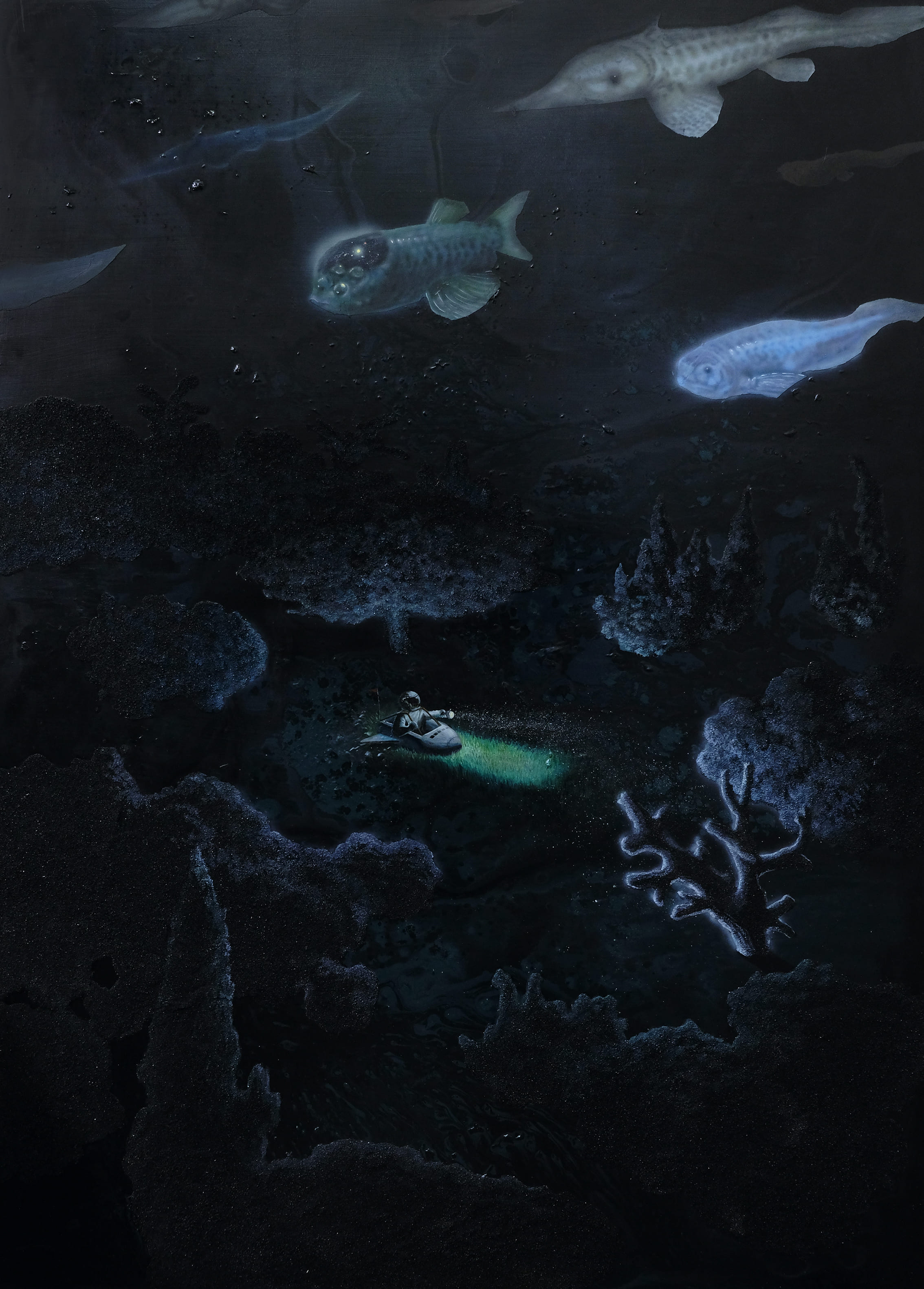 在無垠的黑暗中,一束光劃開深海與宇宙的邊界。孤獨的身影穿行於巨大的幻象與幽微生物之間,仿若在凝視自然的深層記憶,也在探問自身的歸屬。光微弱卻頑強,暗示著即便一切終將被黑暗吞沒,存在仍能於縫隙中折射。這是一場關於孤寂與追尋的旅程,人如何在浩瀚無聲之境,證明自身曾經閃爍。
