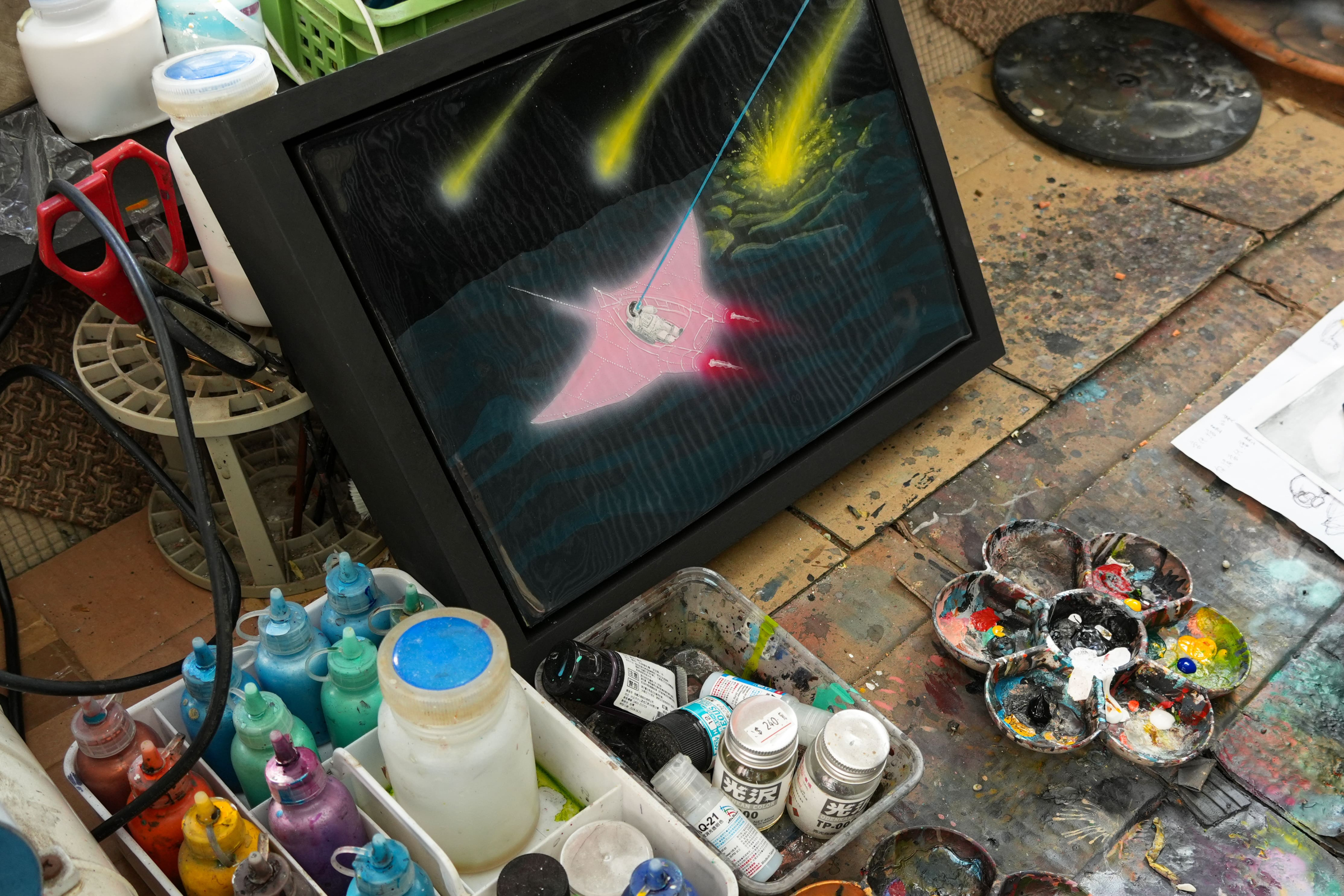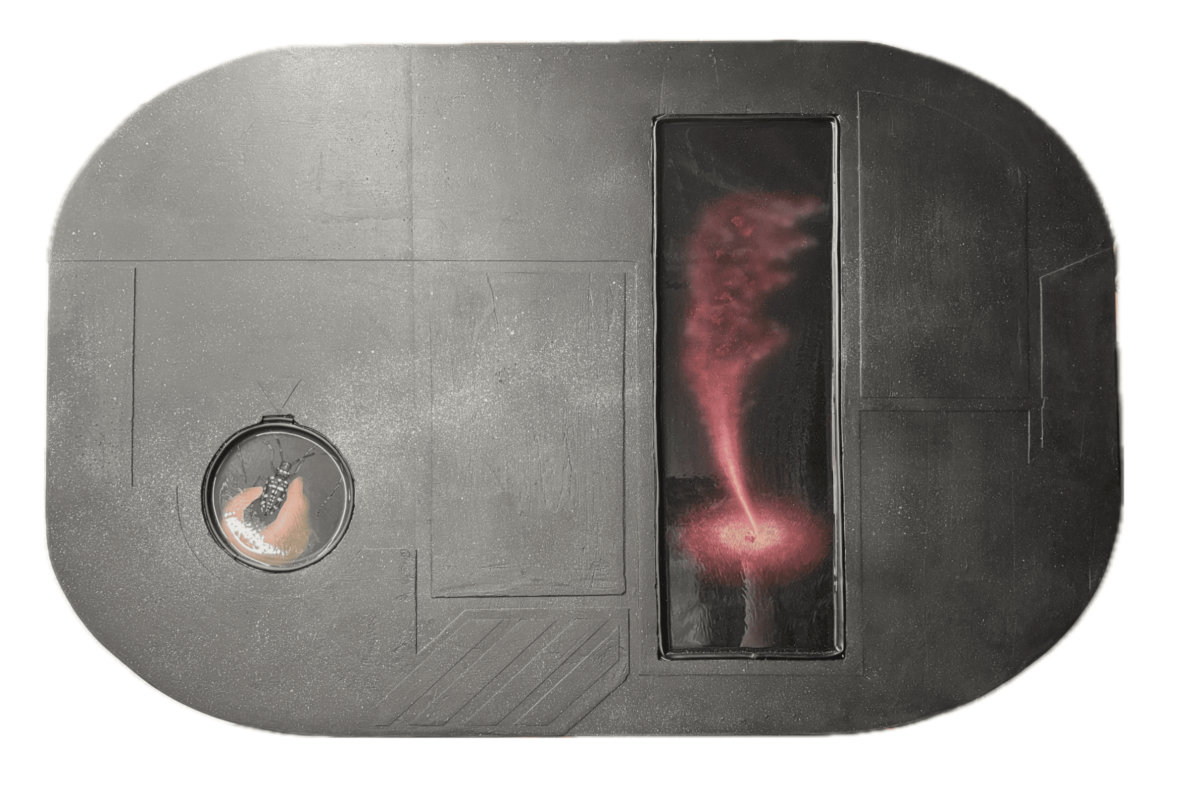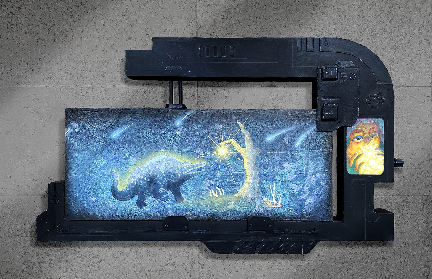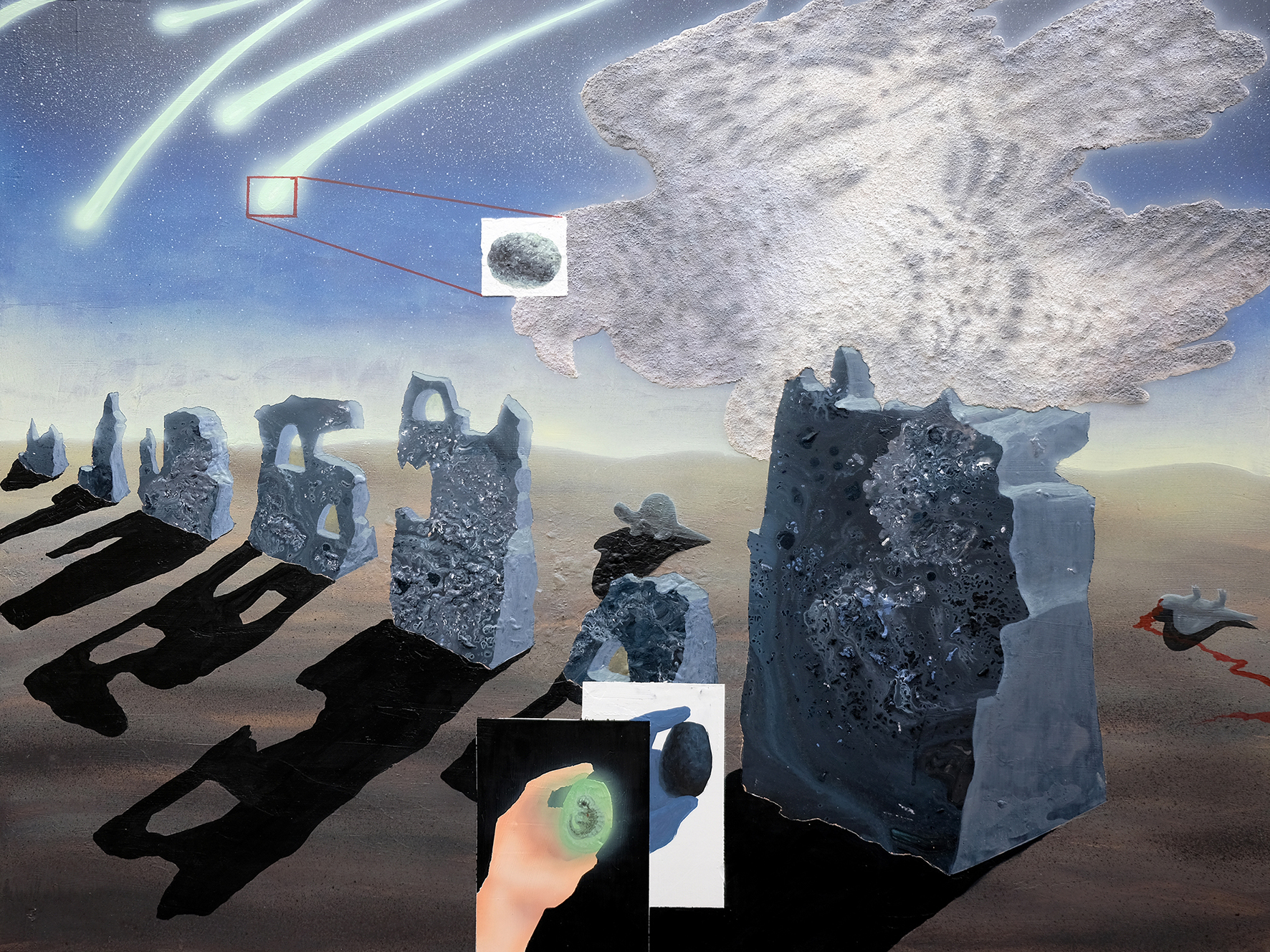 在觀察與想像的延續中,黃彥勳將視線聚焦於人類文明所遺留下的痕跡。作品中時常可見飛行器殘骸、遺跡、光影與塵埃等元素,源於他對宇宙科學、考古影像與廢墟建築的興趣關注,透過長期蒐集與沈澱,將這些知識轉化為具象徵性的畫面結構,成為情感與意義的載體。對他而言,這些物件並不指向某個明確的事件,而是象徵人類在浩瀚宇宙中留下痕跡、試圖證明自身存在的行為。這些物件象徵文明的遺留與記憶的斷裂,而隱約微弱的光線在畫面中折射,則暗示人類意識對永恆的凝視與追尋。