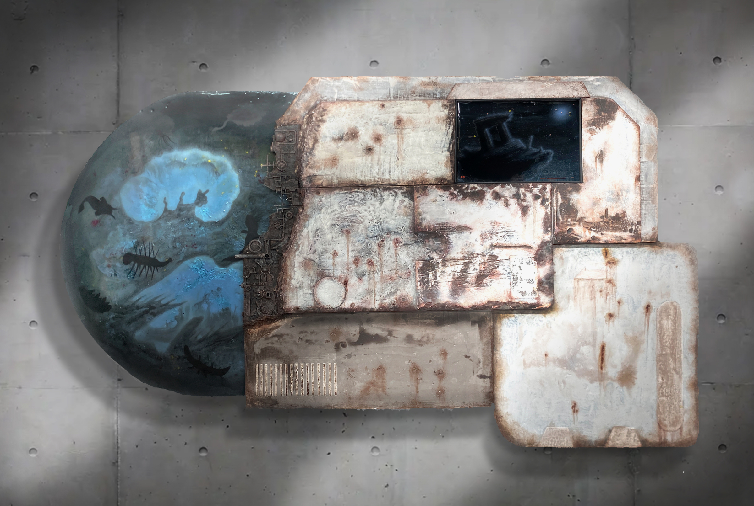一片片時間的殘骸凝結成淡藍色塵埃,折射微弱光芒,閃爍於星環邊緣回望的視野中。時間將一切侵蝕為殘骸,直至塵土荒蕪;面對外在世界,個體如何定義與證明自身的存在?又如何在無垠孤寂中留下痕跡?展覽《孤絕的殘骸 — 微光折射於空隙之間》中,藝術家黃彥勳結合繪畫與物件裝置,探索人類在虛無宇宙與時間洪流中的抵抗與追尋,以及個體面對外在世界的存在辯證。以殘骸、遺跡與生命等符號構成視覺語言,微光與斷裂訊息在虛空中折射,放大孤獨感。然而,孤獨並非虛無,而是宇宙中人類獨有的詩意。