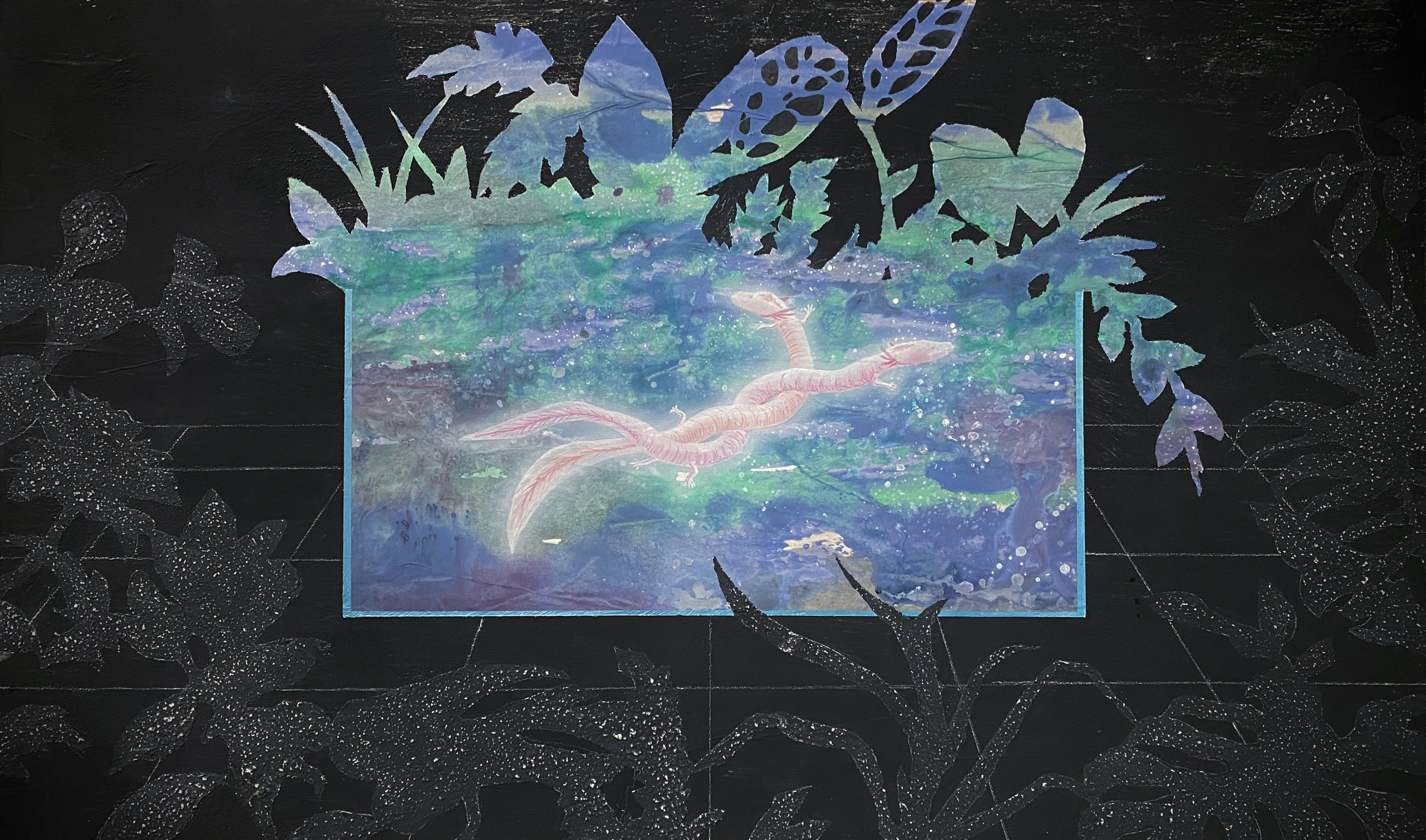 在創作過程中,黃彥勳大膽嘗試不同材質、手法及題材所碰撞出的多重可能性。在〈凝視〉、〈墜〉等作品中,能看到多個畫格拼貼,將時間、記憶切割成片段,每個片段呈現不同的視角或情緒。這種碎片化手法是黃彥勳對於畫面敘事一種非線性敘事的構圖嘗試,不同場景視角讓畫面有節奏感,也打破傳統的單一透視。這種構圖既提供視覺動態,也讓觀者在觀看時產生探索感,彷彿在解讀一段逐漸拼湊的故事。