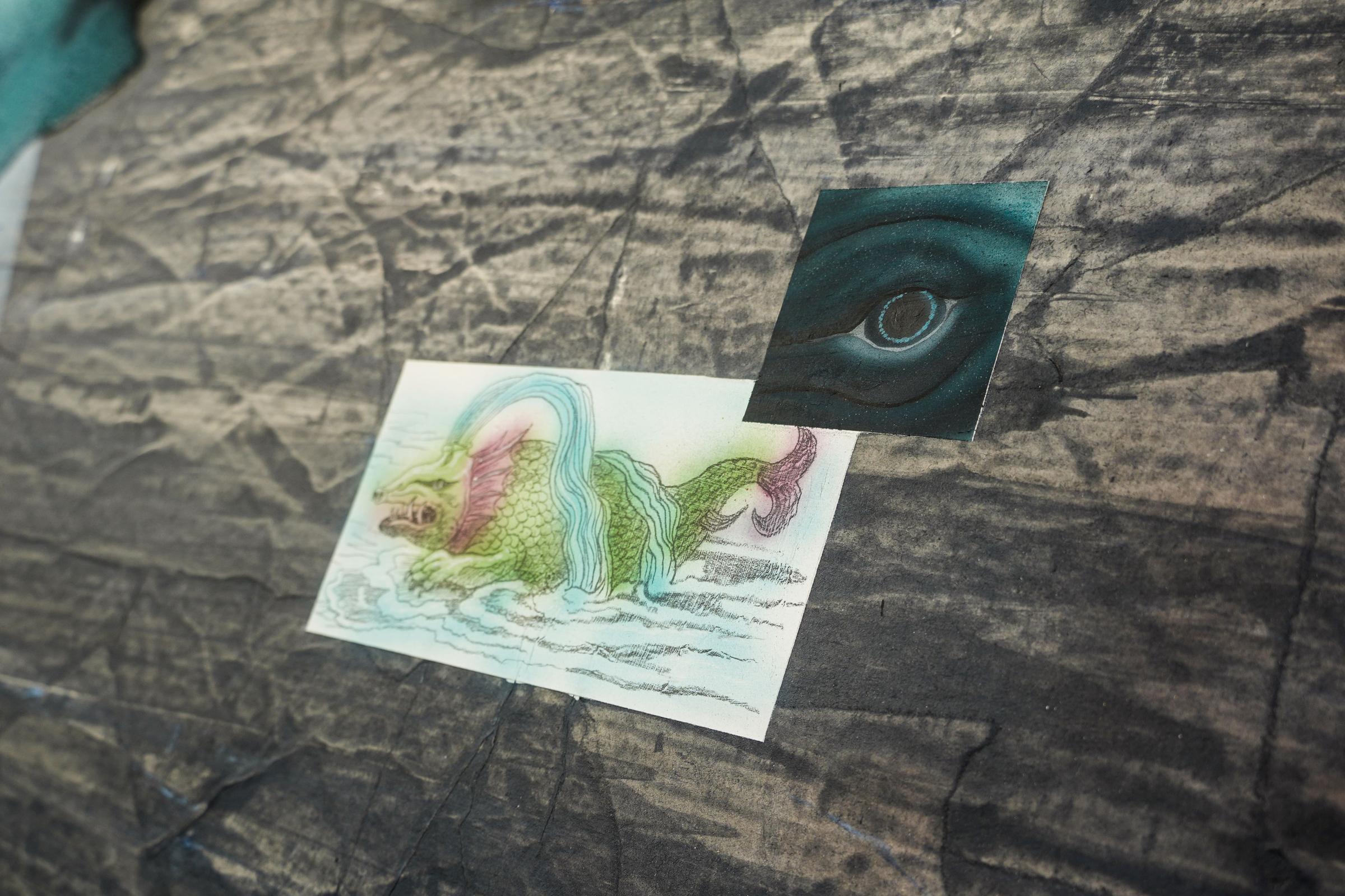 ▲ 黃彥勳 〈凝視〉細部,⽊板、宣紙、碳酸鈣、壓克⼒、炭精筆、亮光漆,80 x 140cm,2025